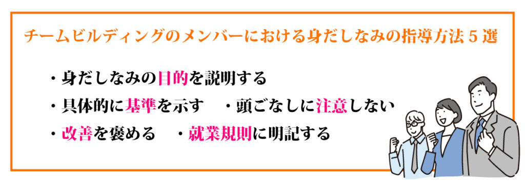 チームビルディングのメンバーの身だしなみについては、具体的に基準を示して指導することが望ましいです。
